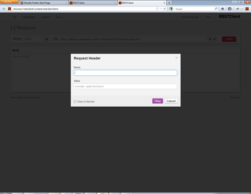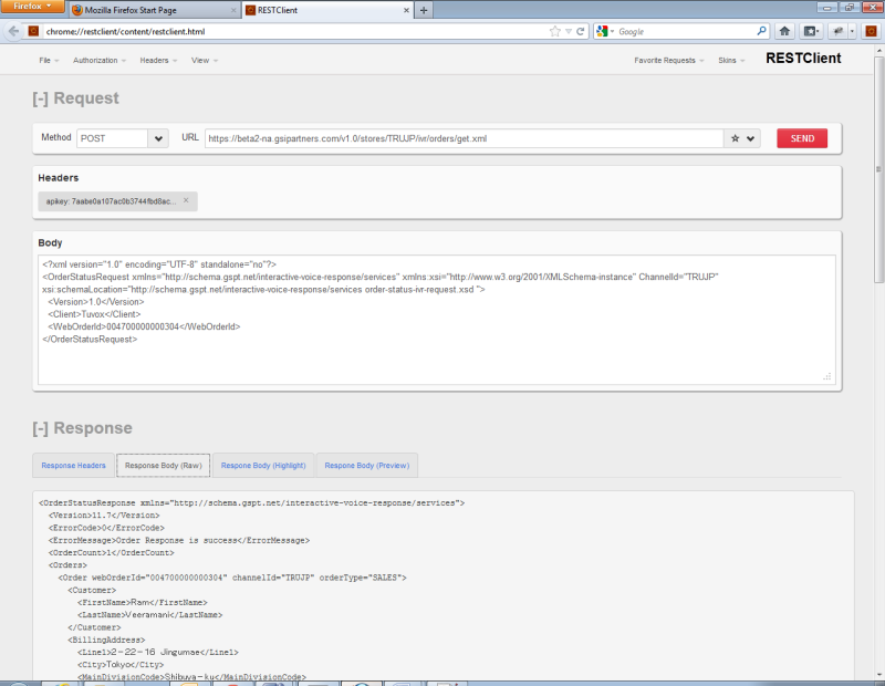 You can add the API Key data as a Request Header programmatically when the request is prepared to be sent to the Radial Fraud Insight API. The following example shows this technique in two tools: the REST Client for Firefox and Java.